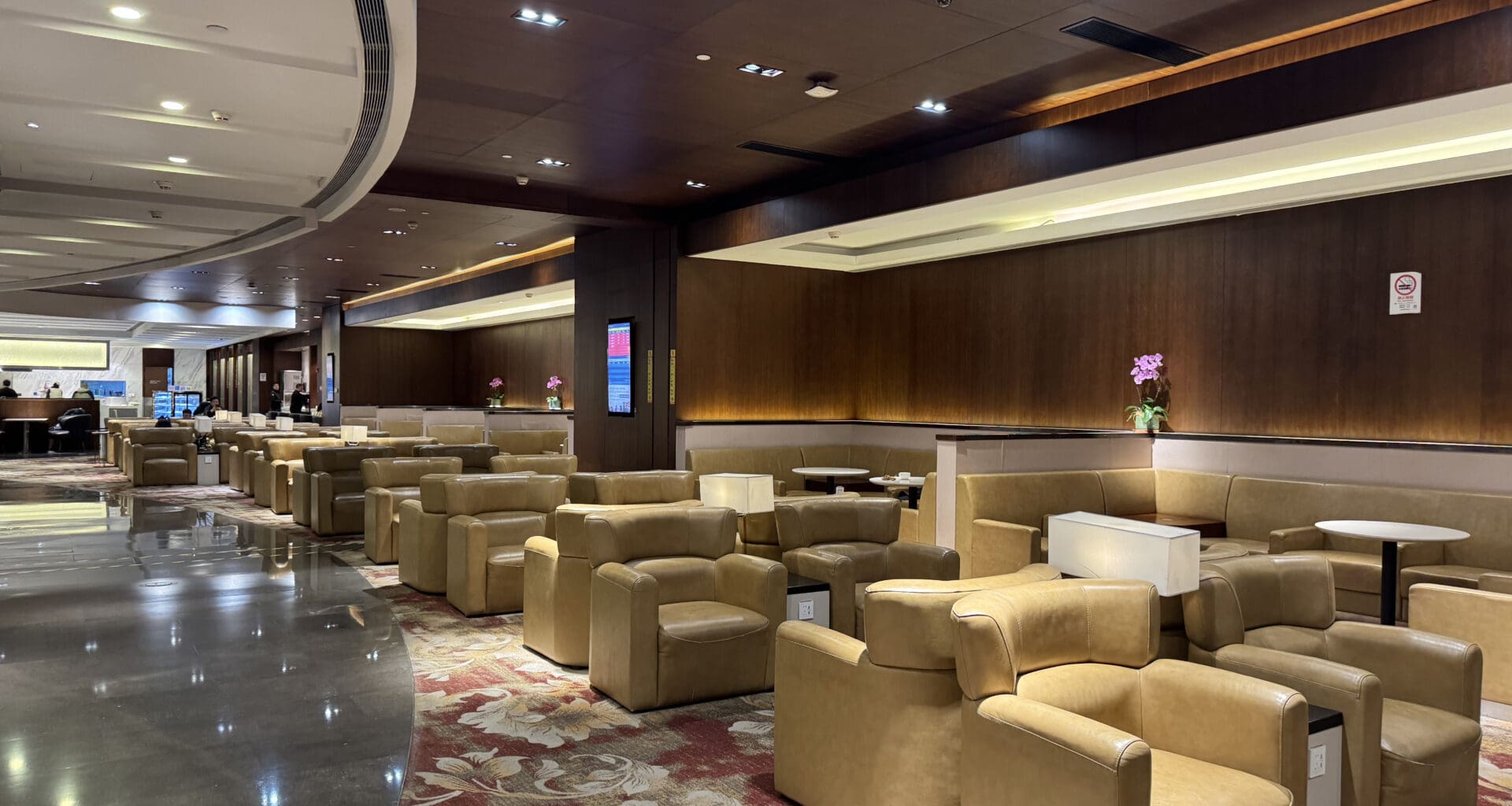 The China Eastern Lounge 35 is one large rectangular room full of seating, with a few nooks, crannies, and partitioned off areas for more private seating. The main area featured these beige and brown-looking armchairs, as well as some booths to the side with round tables.