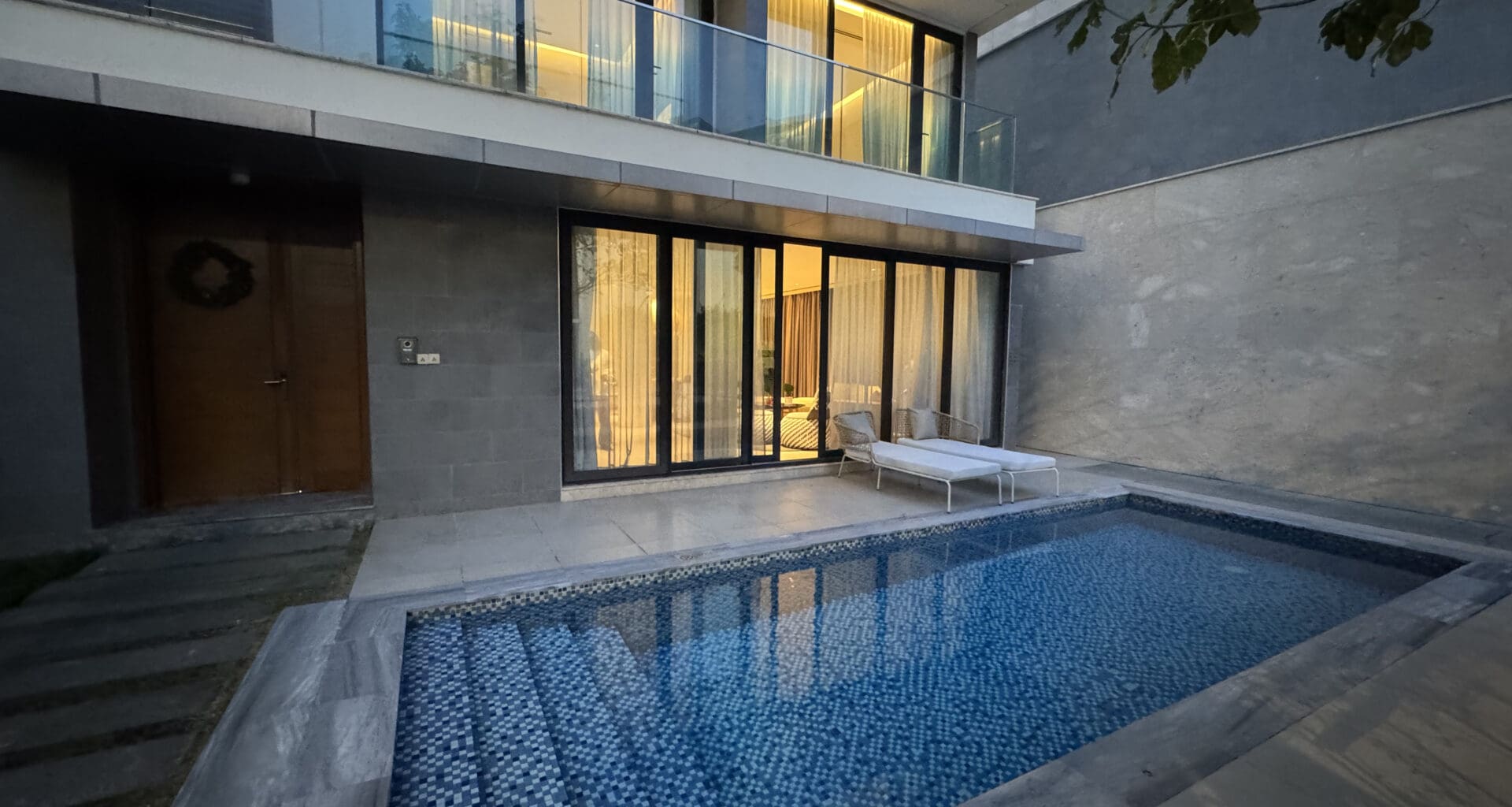 Our four-bedroom pool villa at the Five Villas & Resort Quangnam was numbered room B2, and was quite close to the main entrance – it was possible for Grab rides to drop us off right outside our room. Here’s what the exterior of the room looks like – as you can see, there’s a pool that’s situated right outside the room.