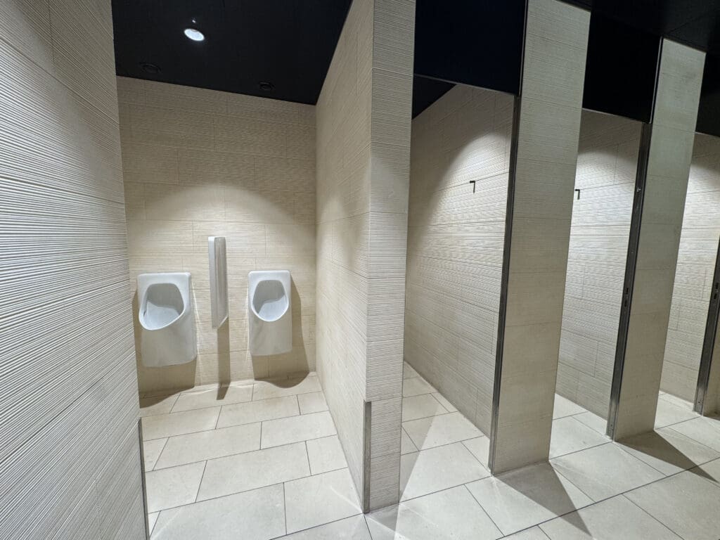 The Swiss Alpine Lounge has two sets of bathrooms. There are conventional bathrooms near the dining area, and individual cubicles near the work/relax area.
