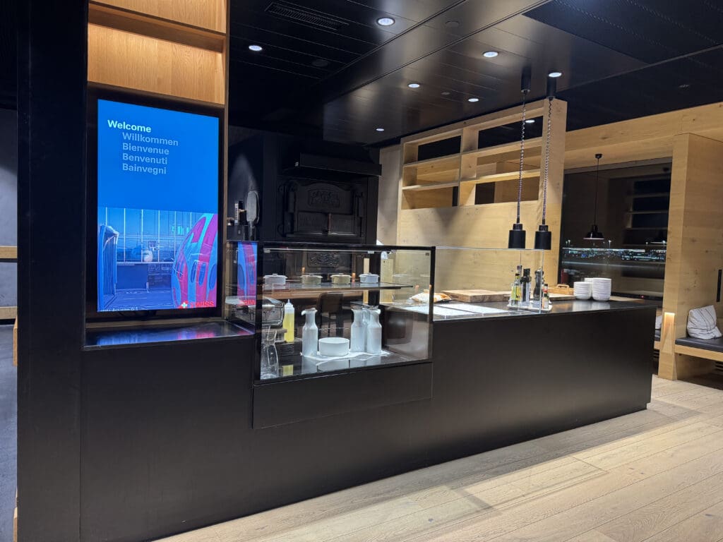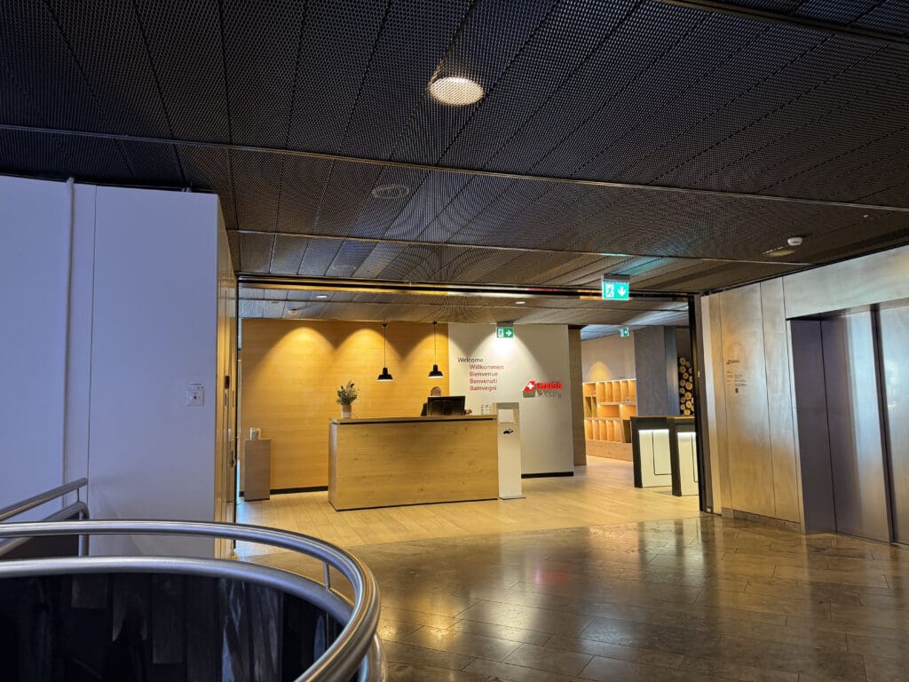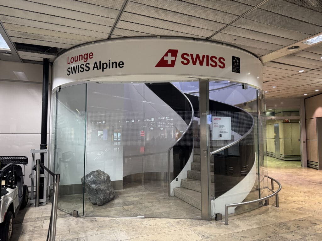 The Swiss Alpine lounge is located on the lower floor of the concourse, on the north end of the concourse, by some transfer desks. In fact, you can get from the main A lounge to the Alpine lounge entrance in under a minute – simply go to the end of the concourse, take the stairs down, and you’ll see the Alpine lounge to your left.