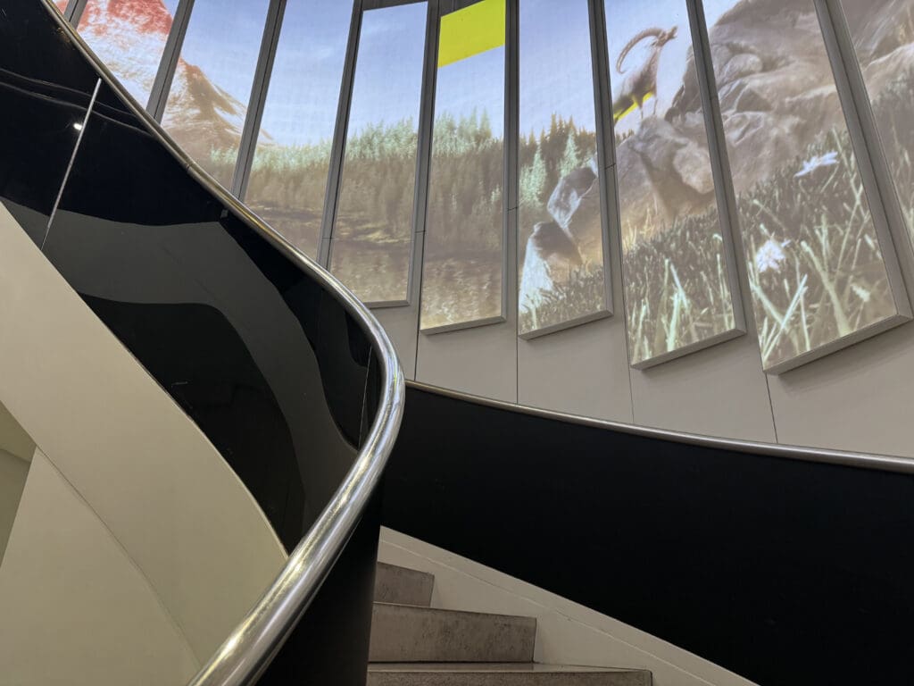 There are some panels showing some (presumably) Alpine scenery as you head up the spiral staircase to the lounge.