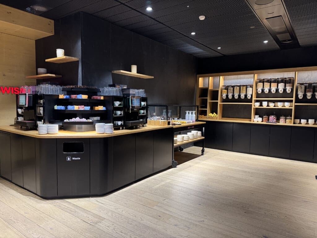 The Swiss Alpine lounge has a small food spread section, located in the main dining area of the lounge.