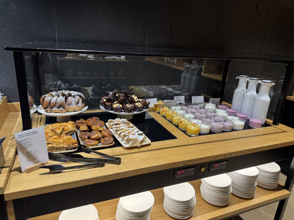 For breakfast, there was cake, muffins, yoghurt, and some pastries.